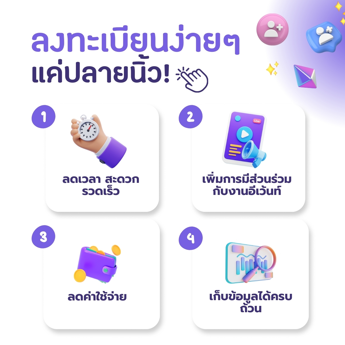 - ลดเวลา สะดวก รวดเร็ว ในการลงทะเบียนเข้างาน